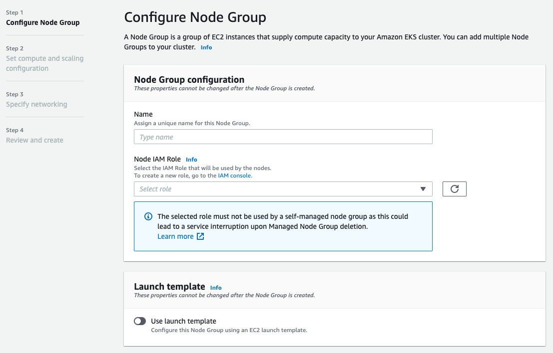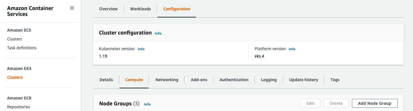 - AWS Managed Console - Services - EKS - Cluster - Configuration - Compute - Add node Group