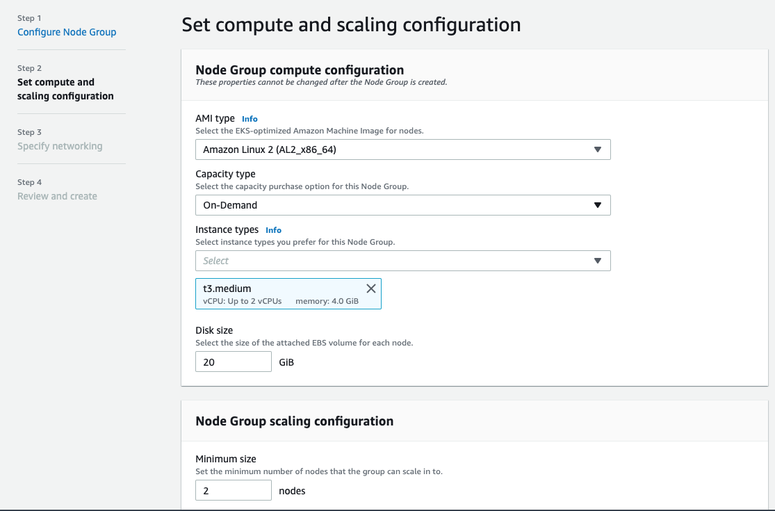 - LT를 선택하지 않으면 아래와 같이 다음 step2와 step3 에서 AMI type/Instance types/Disk size/Min/Max/Desire/Subnets/SSH Kepair 를 입력하여 Nodegroup을 생성할 수 있습니다.