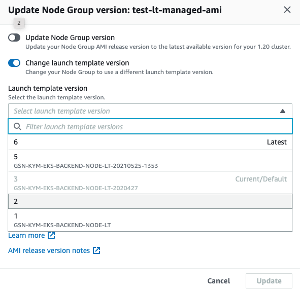 - AWS에서 제공하는 NodeGroup Launch Template 버전 업데이트 기능으로 WorkerNode Instance의 수정이 용이합니다.