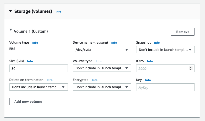 - Instance Type/Keypair/SecurityGroup정보 입력 (Storage의 Device 정보는 /dev/xvda로 자동입력됨 )