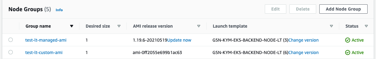 - 아래 이미지의 test-lt-custom-ami가 4번전략으로 생성된 NodeGroup입니다.