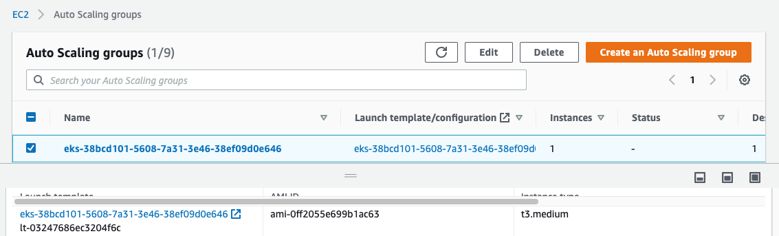 - Nodegroup이 생성되면, 아래 이미지와 같이 자동으로 Autoscaling Group이 "eks-난수"로 생성이 되고 초기 생성에 필요한 Launch Template이 자동으로 생성이 됩니다.